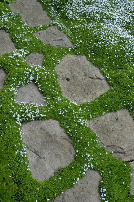 A charming option for walkways that gives a gentle splash of color, Blue Star Creeper is hardy, non-invasive, and excellent for patio cracks or paver joints.