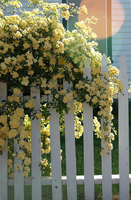 Climbing yellow roses draped over a trellis and fence combo offer a warm, cheerful welcome. This setup adds height and structure to any corner of your yard.