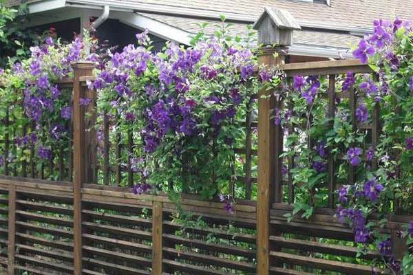 An earthy wooden fence adorned with a long, trailing shrub of tiny purple flowers (like lilac or butterfly bush) offers a lush, romantic vibe. These shrubs provide not only beauty but also privacy and fragrance.