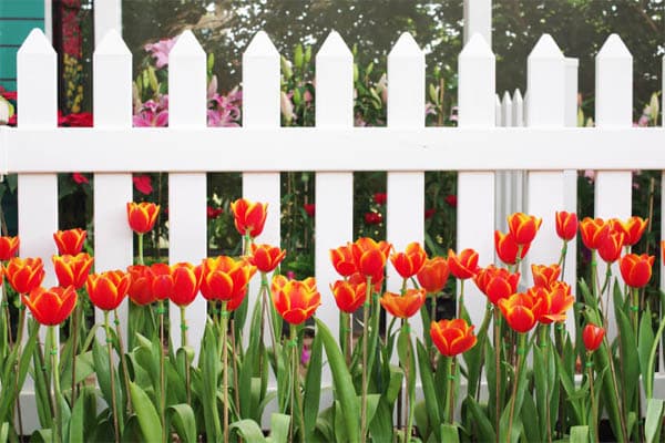 An aluminum fence with a clean white finish offers a sleek, modern look that pairs beautifully with vibrant tulips. The yellow-tipped orange blooms add boldness and seasonal flair.