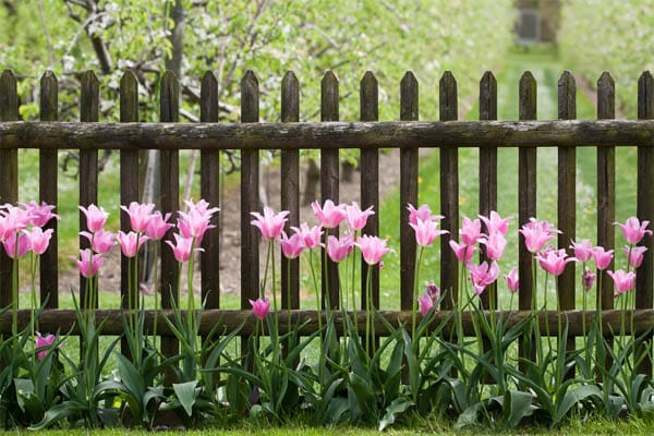 6. Rustic Wooden Picket Fence with Pink Tulips