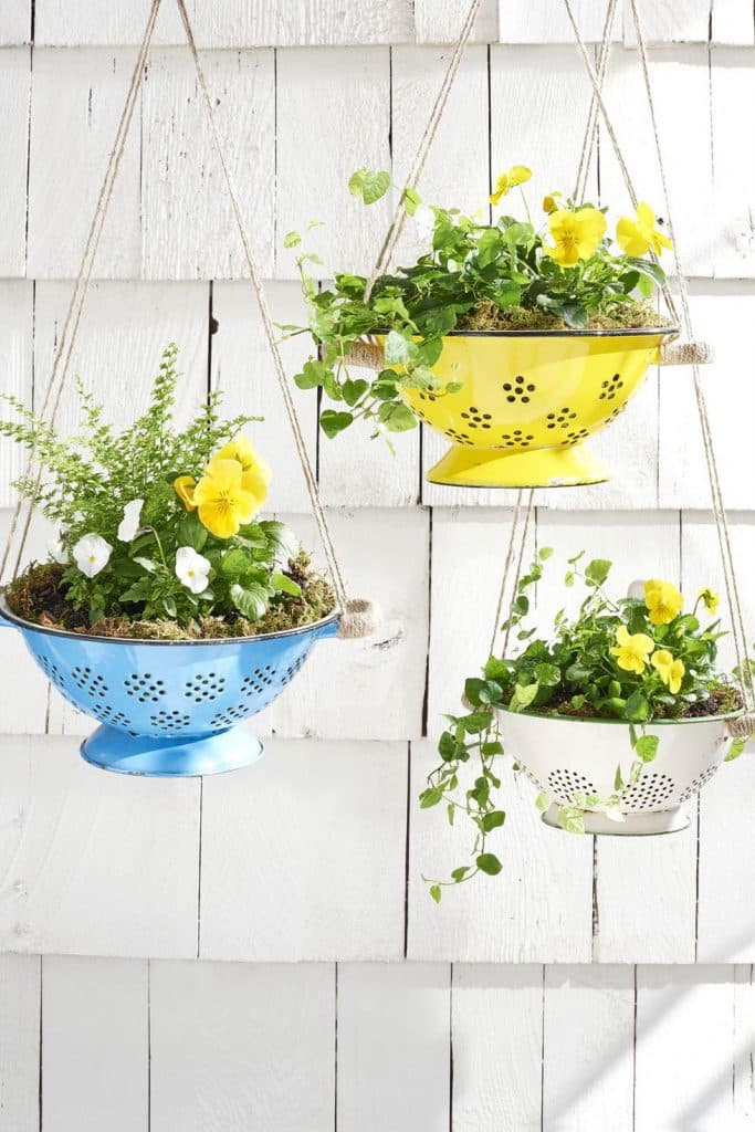 Repurpose old colanders as planters! Their built-in holes make them naturally well-draining. Hang them with chains or macramé from a ceiling or pergola.