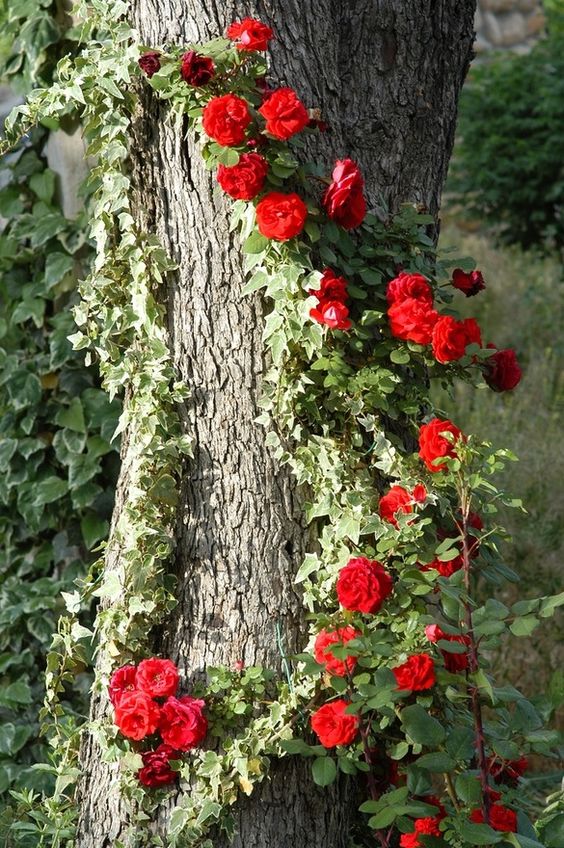 Climbing plants naturally intertwine with tree trunks, creating a wild and romantic effect.