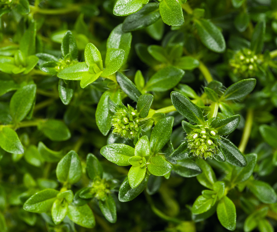 This low-growing perennial herb is incredibly hardy and adapts well to partial shade. It forms a fragrant groundcover with tiny leaves and purple or pink flowers in summer.