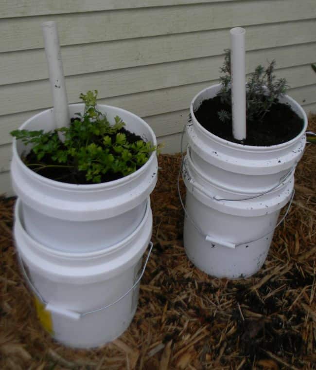 Create your own self-watering containers using buckets—a fantastic solution for busy gardeners.