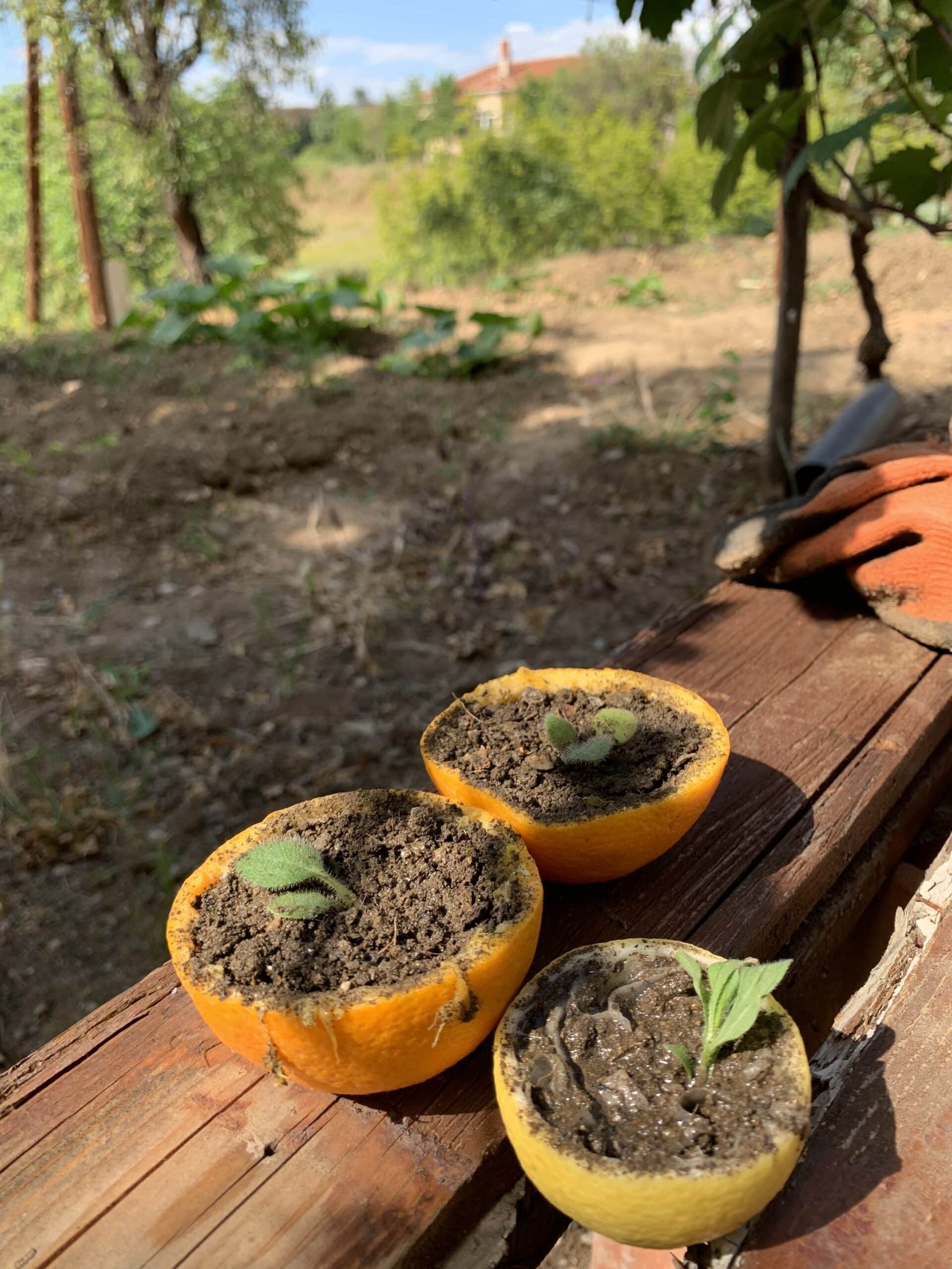 When seedlings are ready, plant the entire citrus “pot” in the soil. As the peel decomposes, it adds nutrients to the ground.