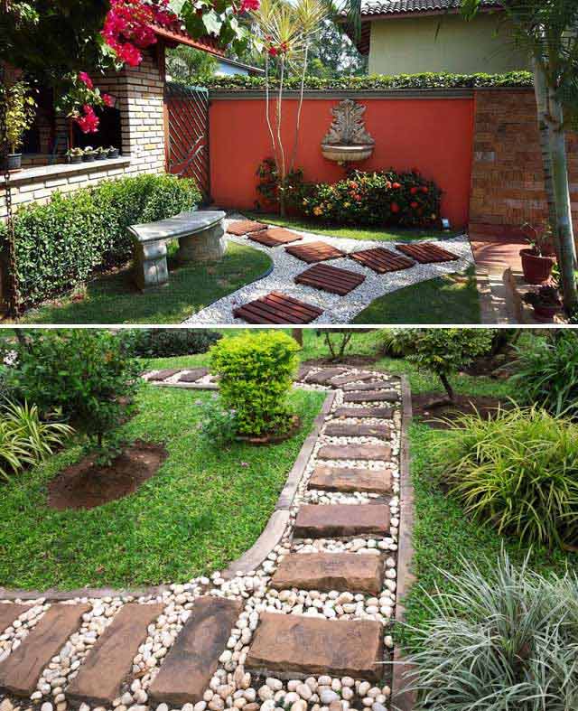 One of the most popular combinations in modern garden design includes clean, square pavers surrounded by grass and small river stones.