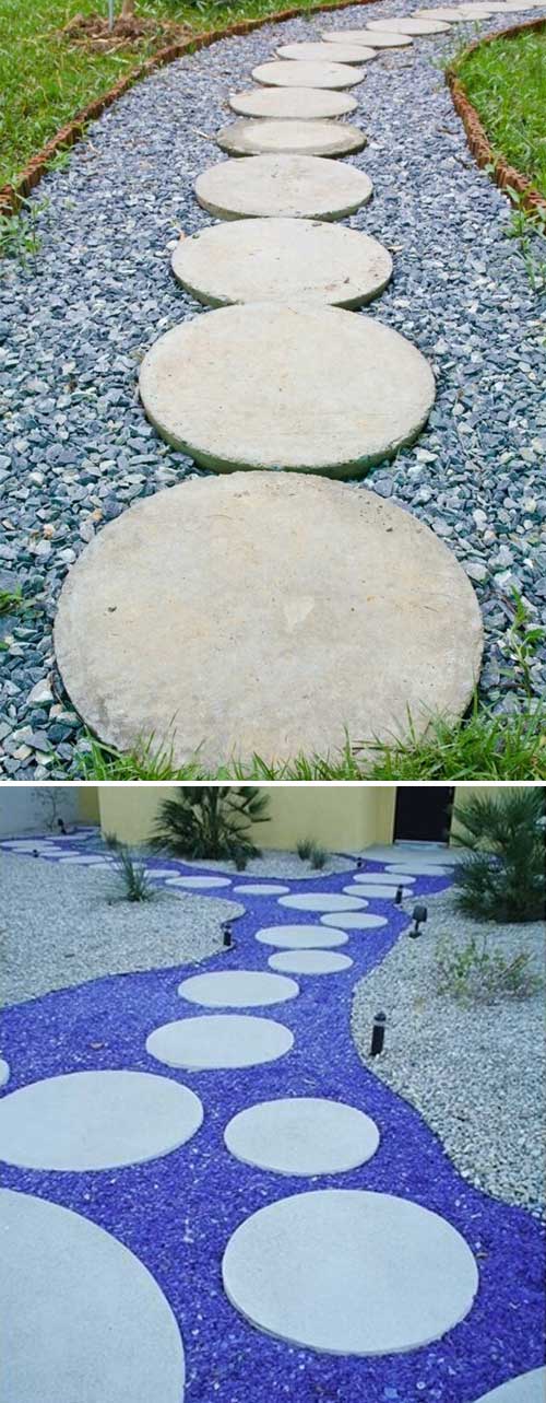 For a bold, colorful twist, use recycled blue glass pieces or crushed concrete as filler between round stepping stones.