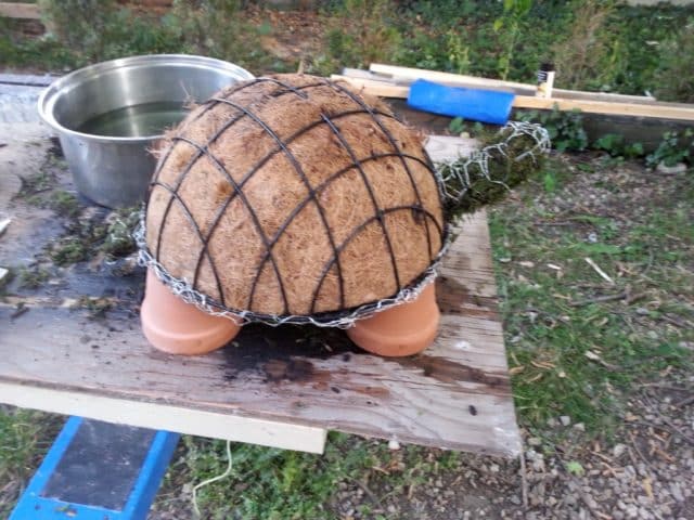 • Take your wire hanging basket with a coir liner and turn it upside down—this will act as the turtle’s shell.