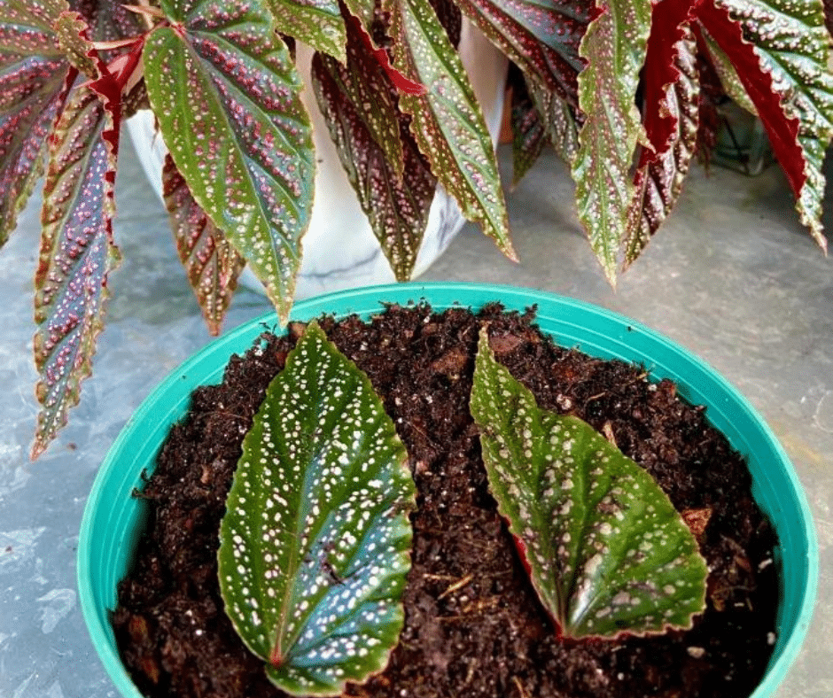 Take a healthy leaf and cut it into sections, making sure each piece includes a vein. Lay the pieces flat on moist soil with the veins facing down and press them lightly into the surface.