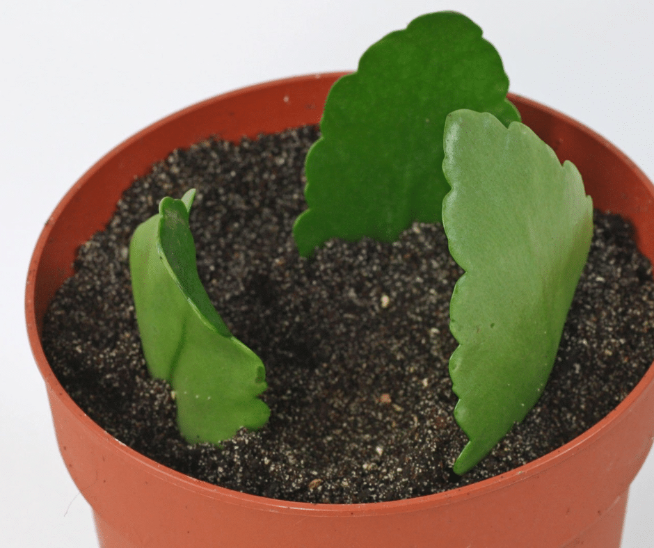 Remove a healthy leaf and let it dry for 2–3 days. Once calloused, place it on top of slightly moist cactus soil. Roots will form from the base within a couple of weeks.