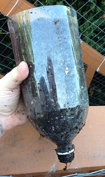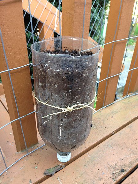 - Fill the bottle with potting mix, pressing it down lightly. Add a layer of compost on top while leaving about one inch of space at the top.