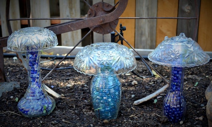 One of the simplest and most whimsical ways to decorate your garden is by making glass mushroom garden ornaments from old household items.