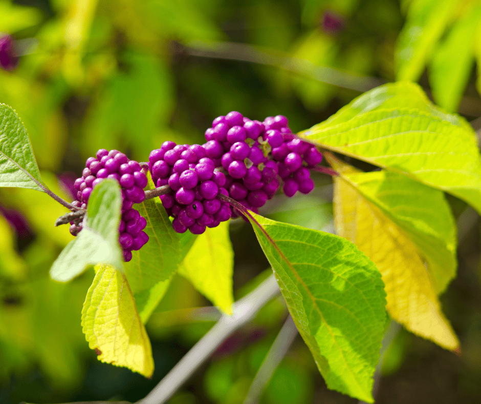 The beautyberry is a plant that turns into fall during the season. Its purple berries sparkle and beckon fruit-eating birds like cedar waxwings, cardinals , catbirds to come enjoy them!