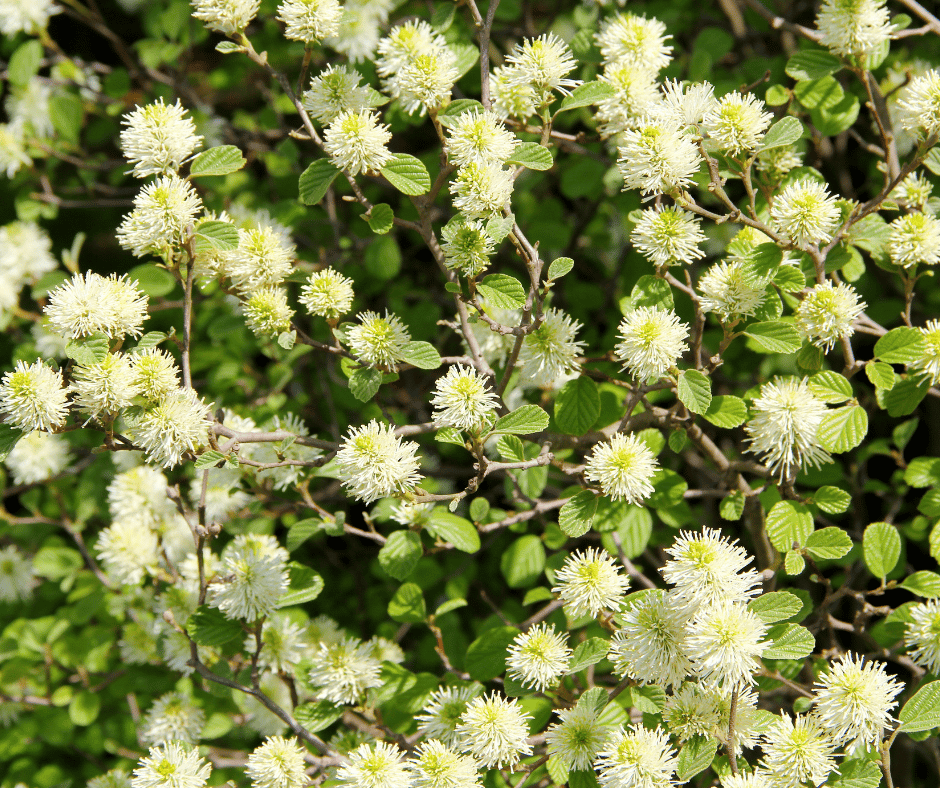 The flowers of the fothergilla plant grow up to 8 feet tall and wide, providing a fragrant early nectar source for pollinators. This type of flower does not require much space in order do so; it can be grown as small or large plants with varying ranges from Zone 5-8 depending upon variety selection.