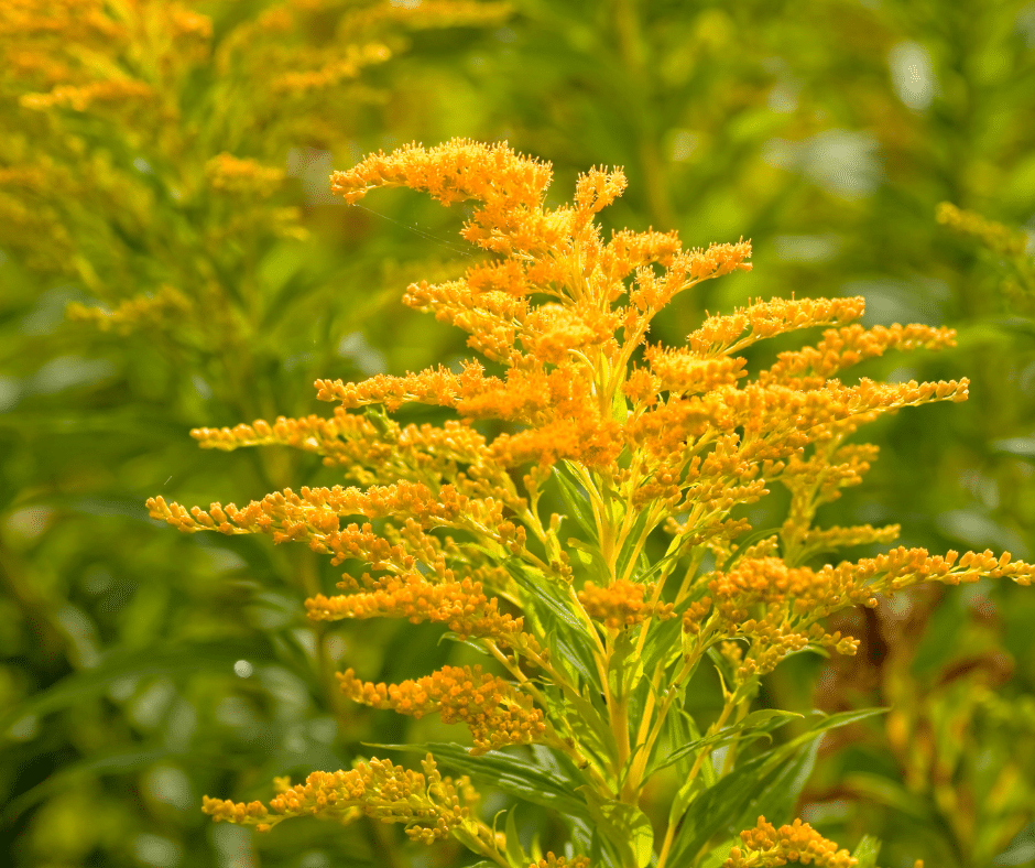 Fireworks goldenrod (Solidago rugosa) is a small, flower-sprouting plant with gold blooms. These flowers attract pollinatorsk, however deer and rabbits don’t seem to like this plant!