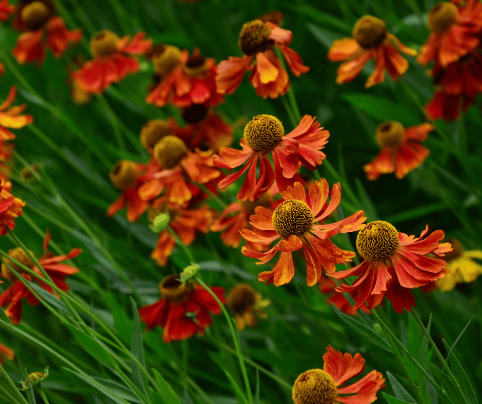 Helenium autumnale or sneezeweed is a full sun perennial that starts blooming in late summer and continues through early fall. It makes for an opening act of sorts with its traditional colors – orange, red & gold!