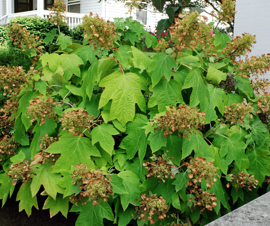 Fall is the perfect time to talk about Hydrangea quercifolia, an overlooked shrub that’s a native plant. Not only does this hydrangea have fiery leaf tints and fading flowers in pink shades but it also produces cone-shaped heads with white petals which slowly turn parchment by winter!