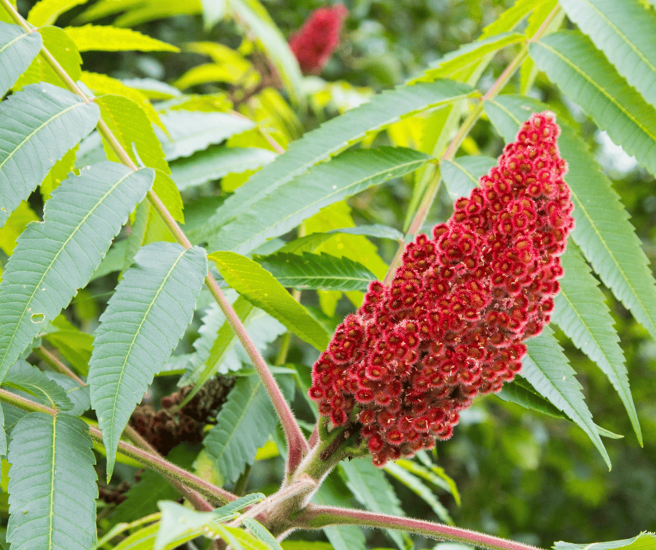All summer long, you can’t help but notice the bright red leaves of sumacs. They are native to North America and offer multi-season interest with their vibrant colors in autumn as well as winter when they’re covered in fuzzy berries!