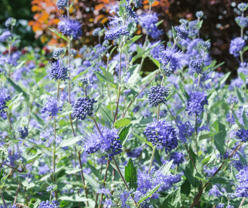 Also known as bluebeard, this plant has beautiful lavender-hued blooms that open in late summer and fall. A variety called ” Sunshine II” comes with gold leaves paired perfectly against purple flowers for an attractive appearance when planted near wildlife gardens or other plants needing pollinator attention.