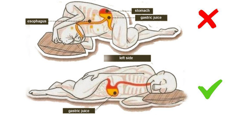When you lie on your left side, your stomach sits below your esophagus, preventing food and acid from flowing upward.