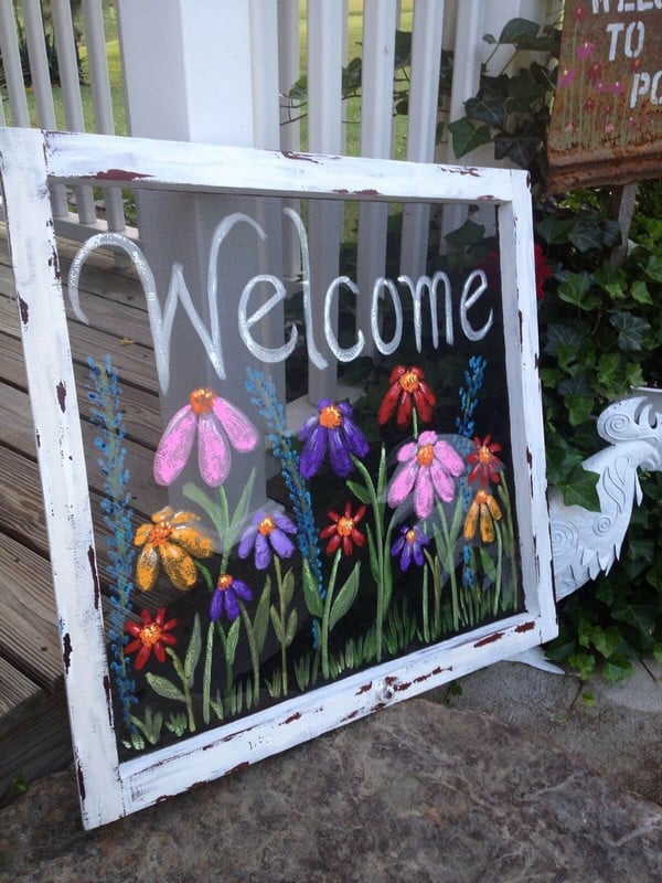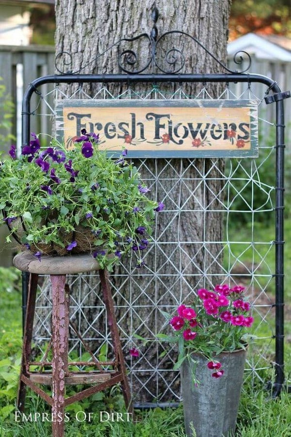 Take an old window screen and paint a handcrafted garden sign over it. This idea gives a textured, airy look that complements a garden full of flowers.