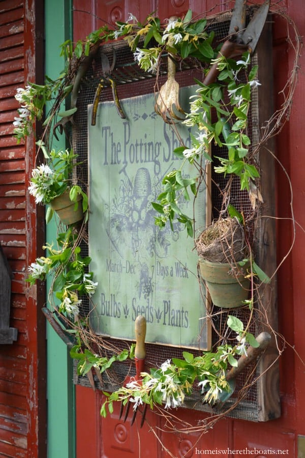 Add large metal letters to your shed or greenhouse for a bold, vintage feel. Words like “Garden,” “Farmhouse,” or “Potting Shed” can give your space a defined aesthetic.