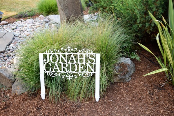 A wood or metal sign with cutout letters creates an elegant, layered effect in any garden setting.