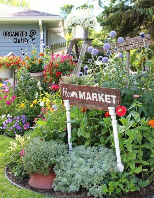 Use upcycled wooden table legs as signposts for a “Flower Market” sign. This French-inspired design adds a romantic and charming feel to your garden.