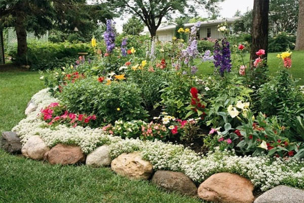 Flower beds bordered by natural stones or colorful pavers