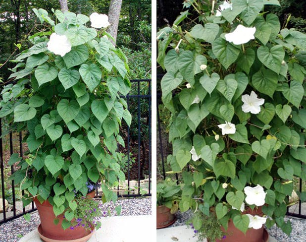 Moonflowers grow quickly and do best in warm climates. In containers, they appreciate a sunny spot during the day and support for their vines. Their heart-shaped leaves and moonlit blooms create a dreamy nighttime display.
