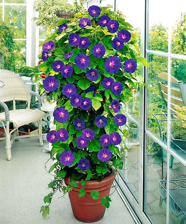 It needs sturdy support and occasional pruning to maintain shape, but it’s an excellent choice for container gardeners who want a quick-growing vertical plant with striking seasonal appeal.