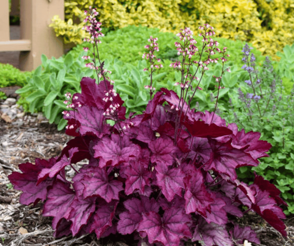 Coralbells is a plant with delicate, bell-shaped flowers that grow to be about 3 inches in diameter and come in an array of colors such as pink, red or white.