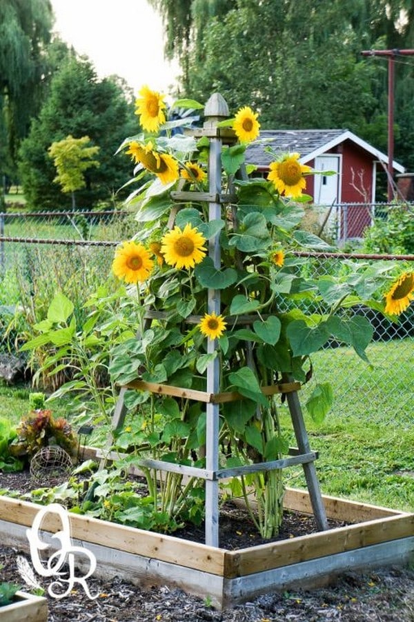 A DIY sunflower obelisk adds height and elegance to your garden.