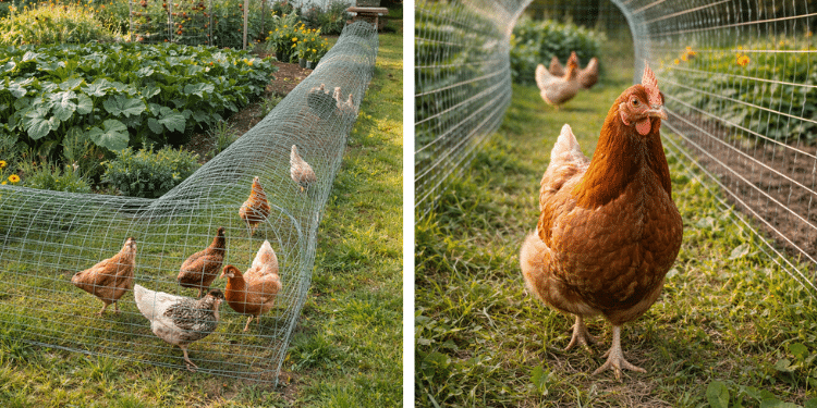 A chicken tunnel is a narrow run made from wire fencing or hardware cloth, shaped into a long corridor. It sits between garden rows, along raised bed edges, or around the perimeter of planting areas.