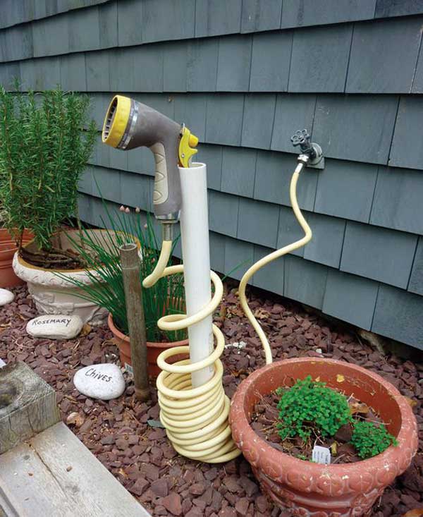 Keep your garden hose neatly stored and tangle-free by creating a simple coiled hose holder using PVC pipes.