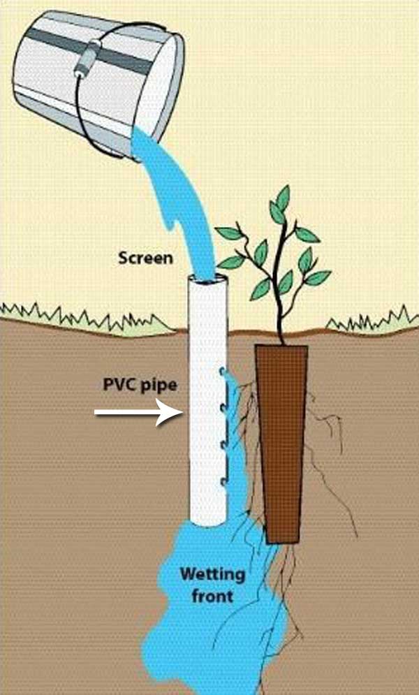 Enhance root hydration by placing an open-ended PVC pipe near seedlings to deliver water directly to the roots.