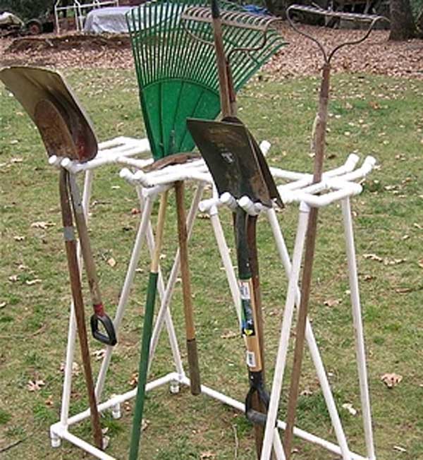 Organize garden tools by constructing a sturdy rack from PVC pipes to keep everything in place and easily accessible.