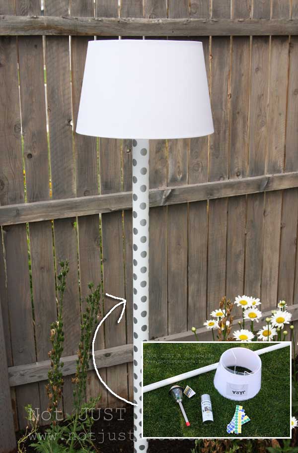 Transform a PVC pipe into a stylish outdoor solar lamp by painting it silver and decorating it with dot stickers for a creative lighting solution.