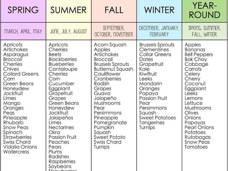 Fall is rich with squash, apples, and root vegetables, while winter highlights citrus fruits, leafy greens, and hearty staples like cabbage and potatoes.
